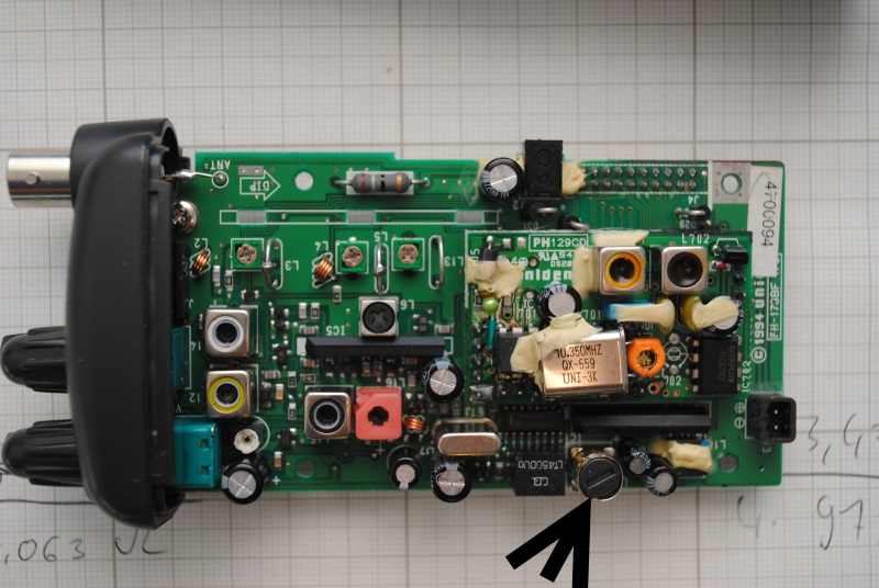 Der verdrehte "Kondensator" ist die dicke schwarze Schlitzschraube unten, worauf der schwarze Pfeil zeigt?