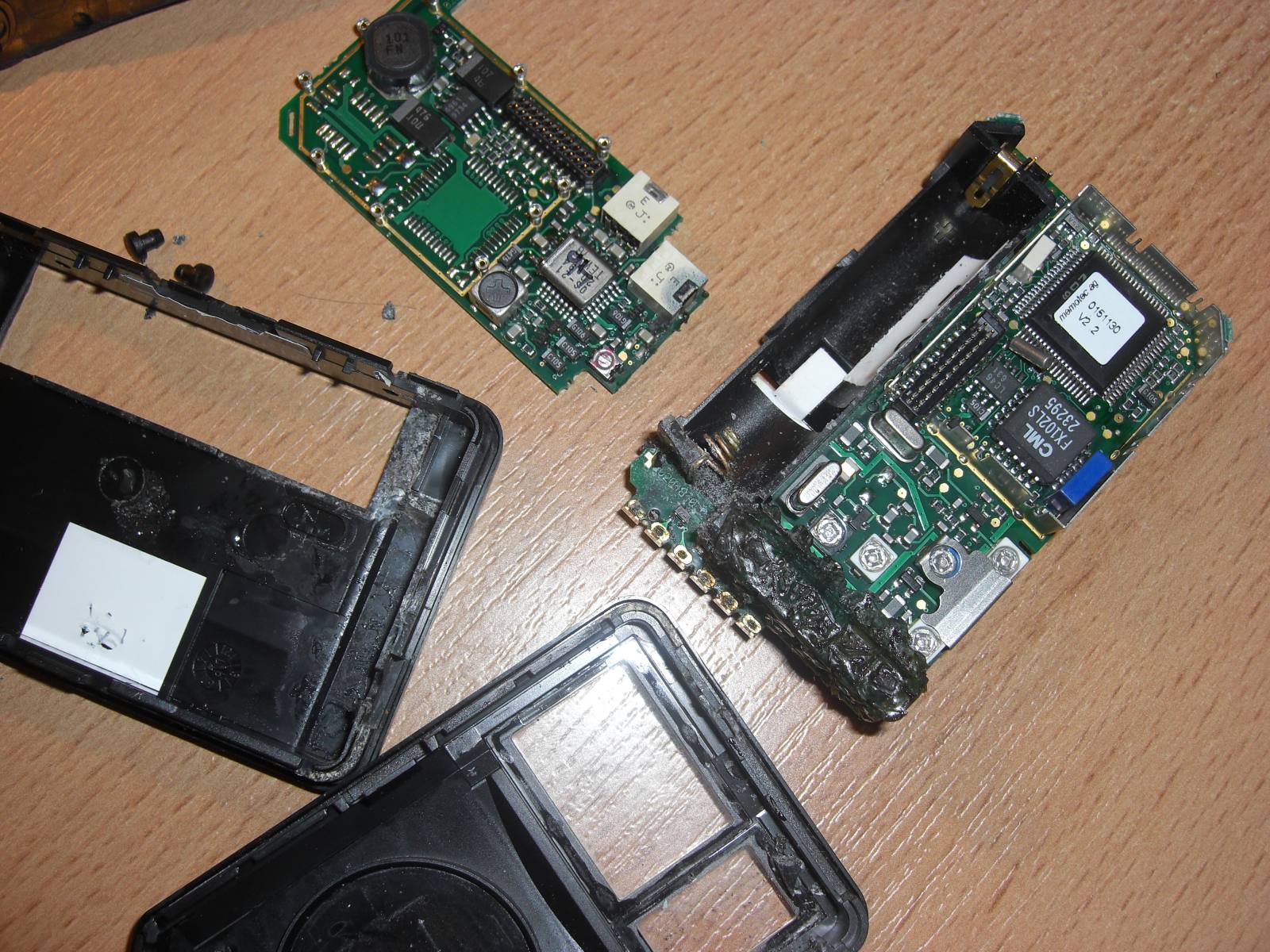 Anbei mal zwei Fotos von einem Quattro 96, in dem ein Akku ausgelaufen ist. Neben einer völlig zerstörten Elektronik (selbst das Display ist ausgelaufen), lösen sich die Kunststoffteile in Staub auf...!