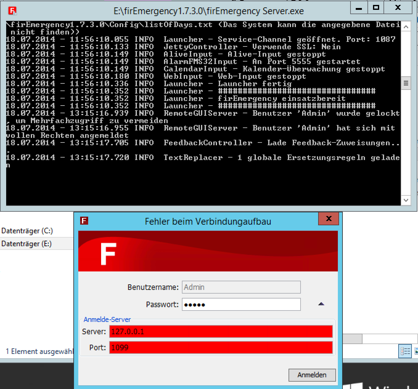ich starten den firEmergency Server und versuche mich am Server über die GUI mit den Standart-Anmeldedaten anzumelden und bekommen den Fehler beim Verbidungsaufbau. Anbei die Logs,hat jemand eine Idee?