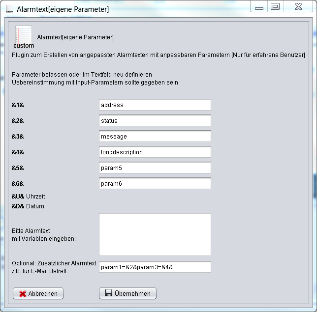 Alarmtext Betreff: fahrzeug!!1!!&datum=!!2!!&uhrzeit=!!3!!