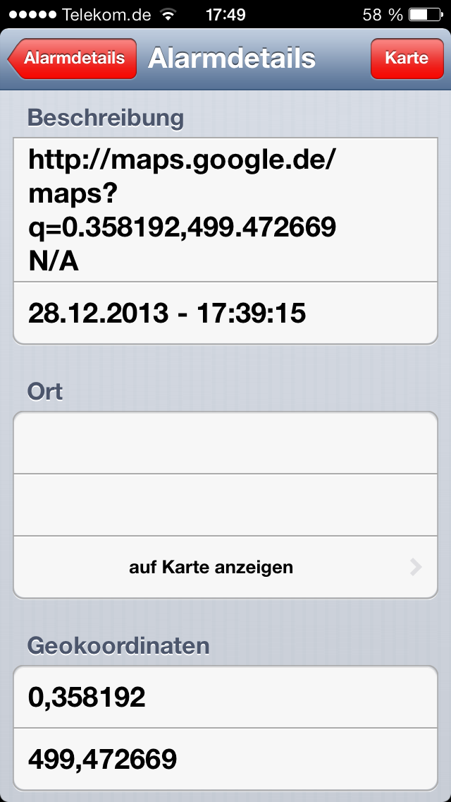 Beim iPad wird zwar in dem dafür vorgesehenen Feld die Straße und der Ort angezeigt, bei Geokoordinaten steht allerdings 0. Es ist also nicht möglich die Karte Anzeigen zu lassen.