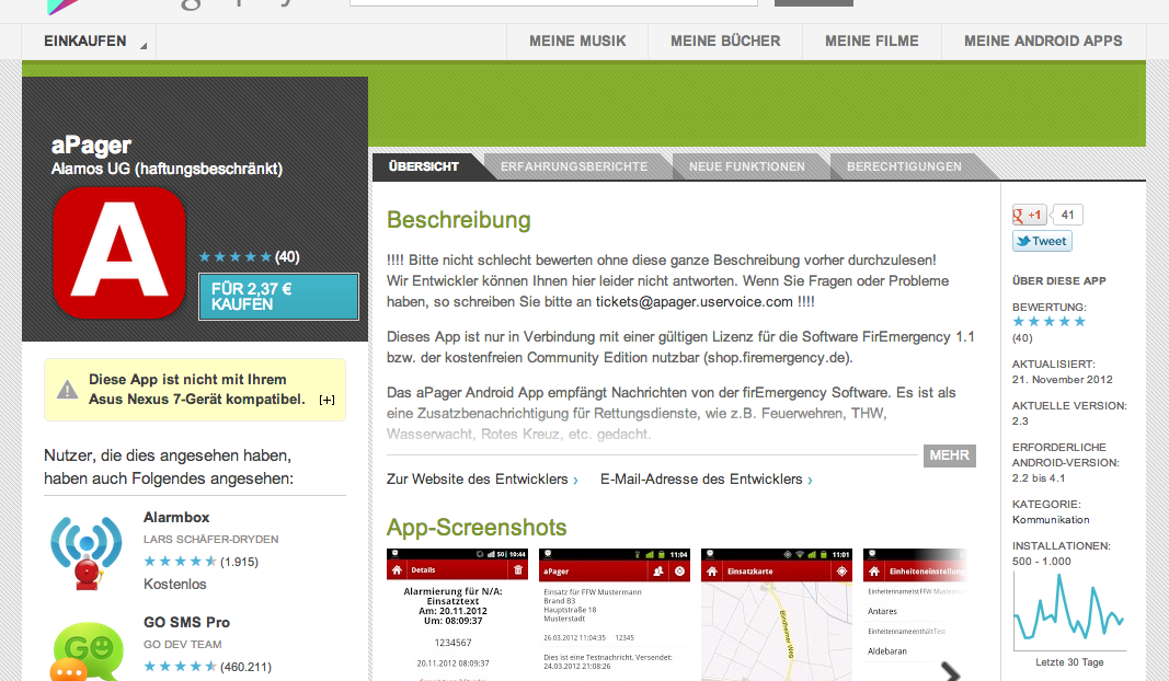 Die Installation auf meinem Nexus 7 ist leider nicht möglich. Screenshot von Google Play hängt an. :)