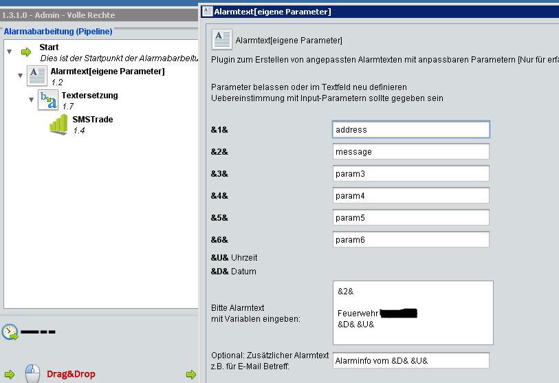 Mit einem Alarmtext[eigene Parameter] kannst du dann mit den entsprechenden Kürzeln (z.B. &2& bei mir) auf die Message zugreifen und ein beliebiger Text erstellen. Hier wird der Text bevor dem Senden noch mit der Textersetzung aufgehübscht und lesbar gemacht.