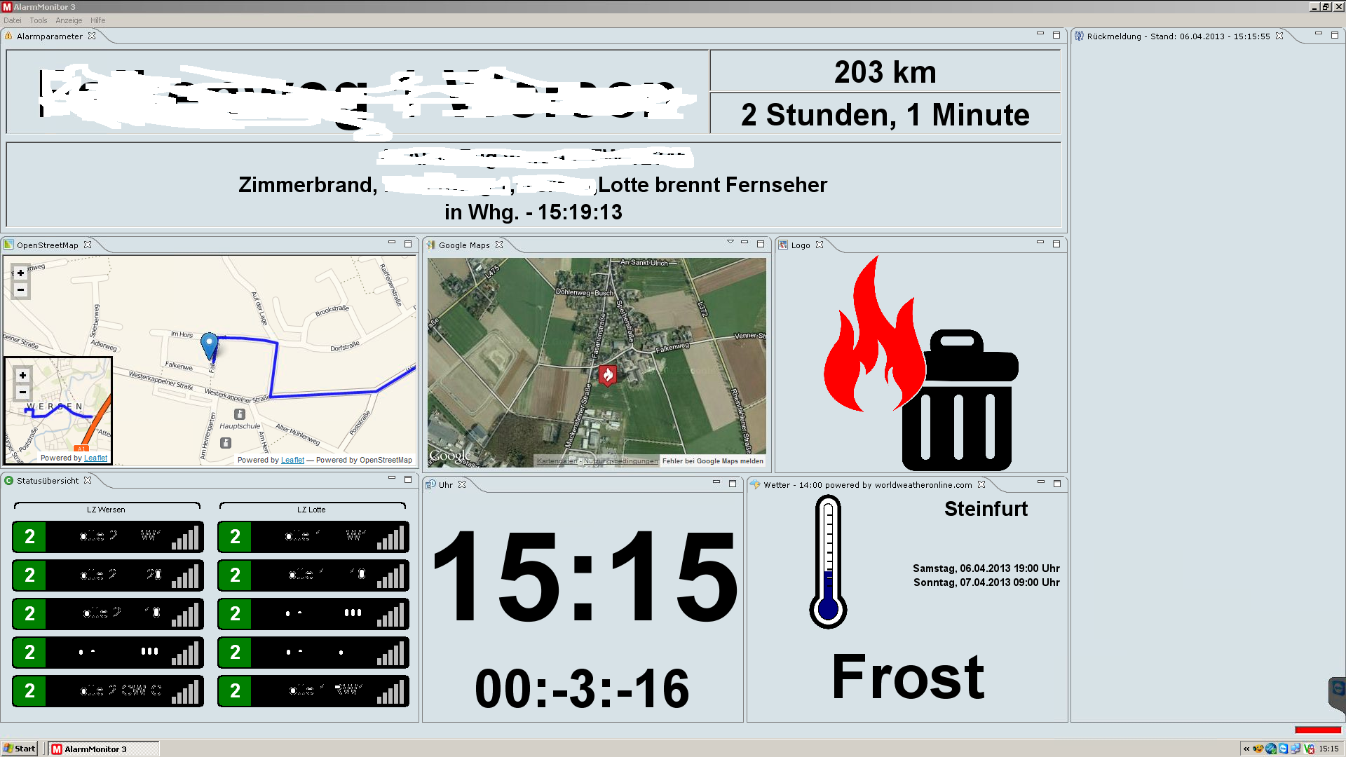 1. Alarmmonitor: Bei eingehender Alarmierung läuft die Alarmuhr erst mit einem Minuszeichen vor der Uhr und zählt auf null ca. -3:00min und läuft danach ganz normal.