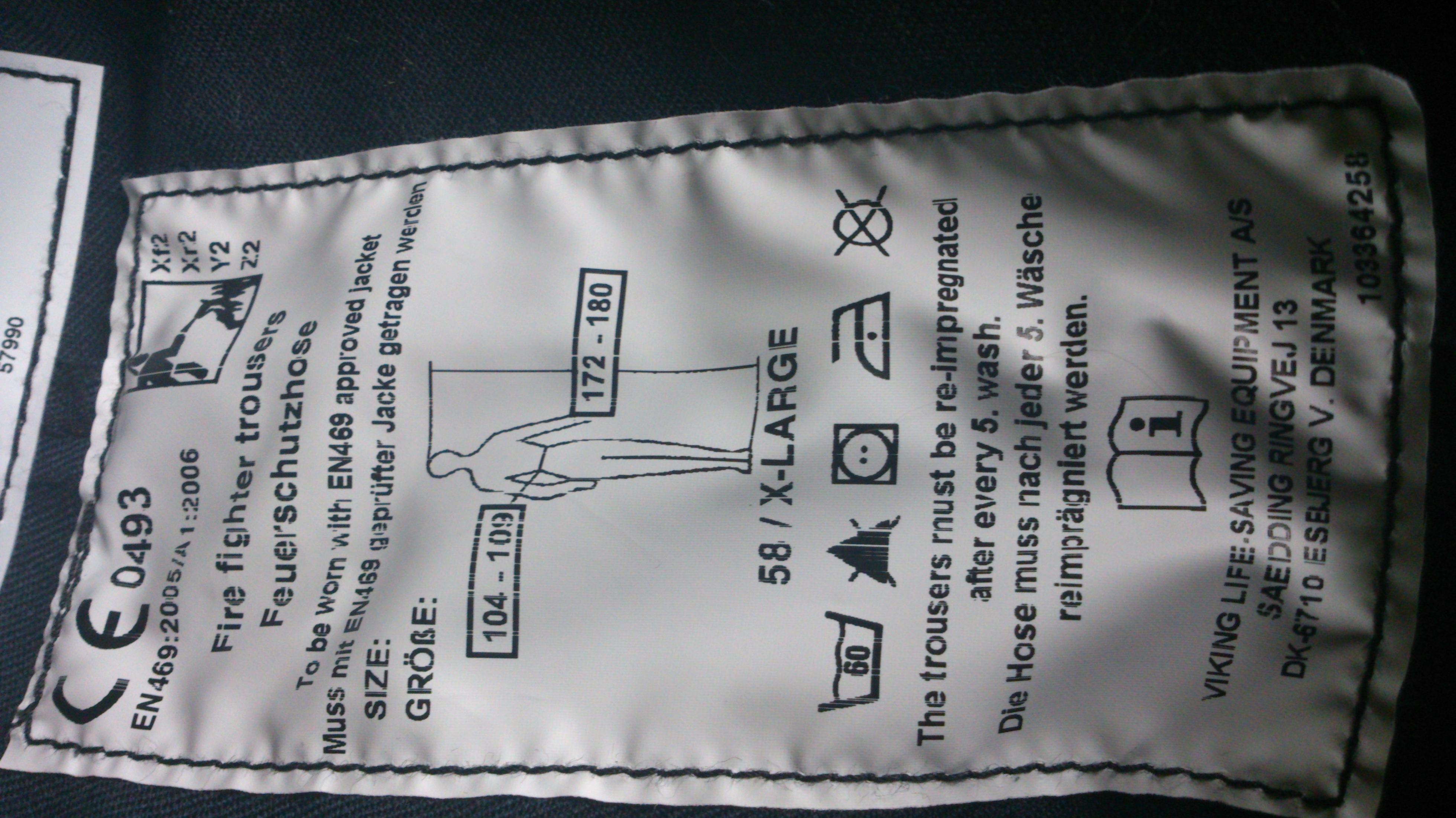 Nach EN 469 erfüllt sie in den vier Anforderungen jeweils die höhere der beiden existenten Schutzstufen (Symbol oben rechts auf dem Einnäher). Eine weitere Hose ist zur Erfüllung dieser Kriterien nicht erforderlich.