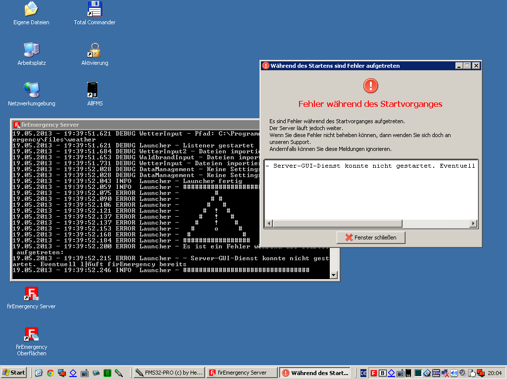19.05.2013 - 19:39:52.215 ERROR Launcher - - Server-GUI-Dienst konnte nicht gestartet. Eventuell läuft firEmergency bereits