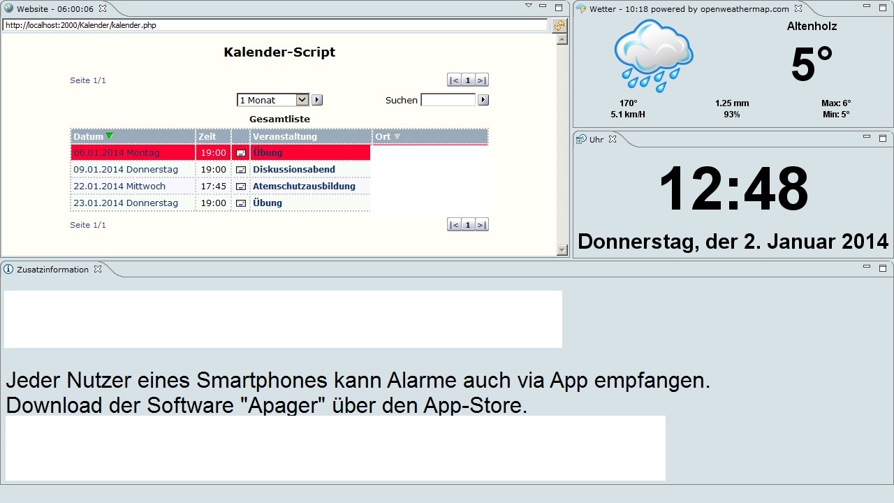 Der Alarmmonitor greift auf ein Kalenderskript zu, bei dem immer die laufenden und kommenden Termine angezeigt werden. Termine, die erledigt sind, verschwinden nach zwei Tagen automatisch aus der Ansicht.