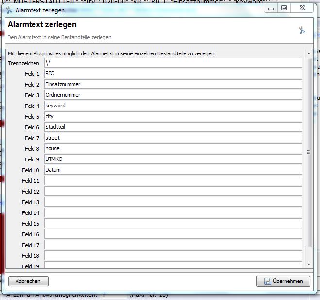 Ich habe nun im Alarmtext zerlegen PlugIn als Trennzeichen /* angegeben, dass Backslash davor weil sonst laut WIKI das PlugIn nicht mit dem * zurecht kommt.RIC1**12345678900**020-00**Wohn/Zimmerbrand **MUSTERSTADT**MUSTERSTADTTEIL**STRAßE** 12 **N0000000E0000000** ** * 28.12.13 19:43 *