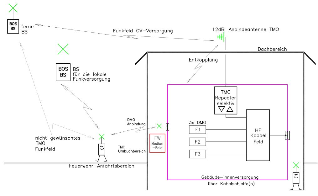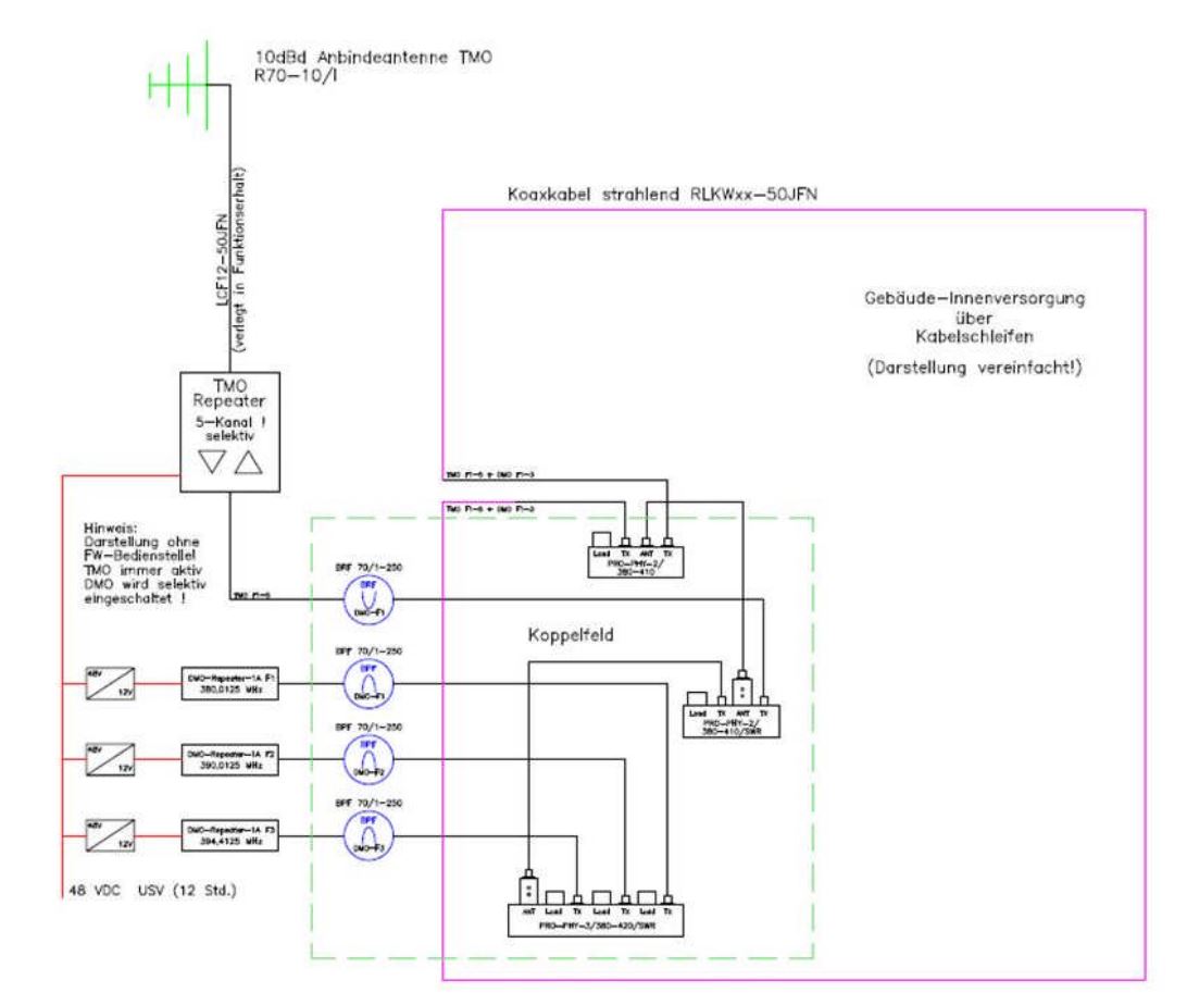 " Die drei DMO-Repeater (Typ 1A) werden mit jeweils einem Bandpassfilter (380-410 MHz) über zwei 2-fach-Hybridkoppler geführt. Diese DMO-Zusammenschaltung und der über einen Bandsperrpass (380-390MHz, abgestimmt auf die DMO-Frequenz im Bereich des TMO-Uplinks) geführte TMO-Repeater werden dann über einen 2-fach-Hybridkoppler (380-410 MHz) auf das Antennennetzwerk geschaltet."