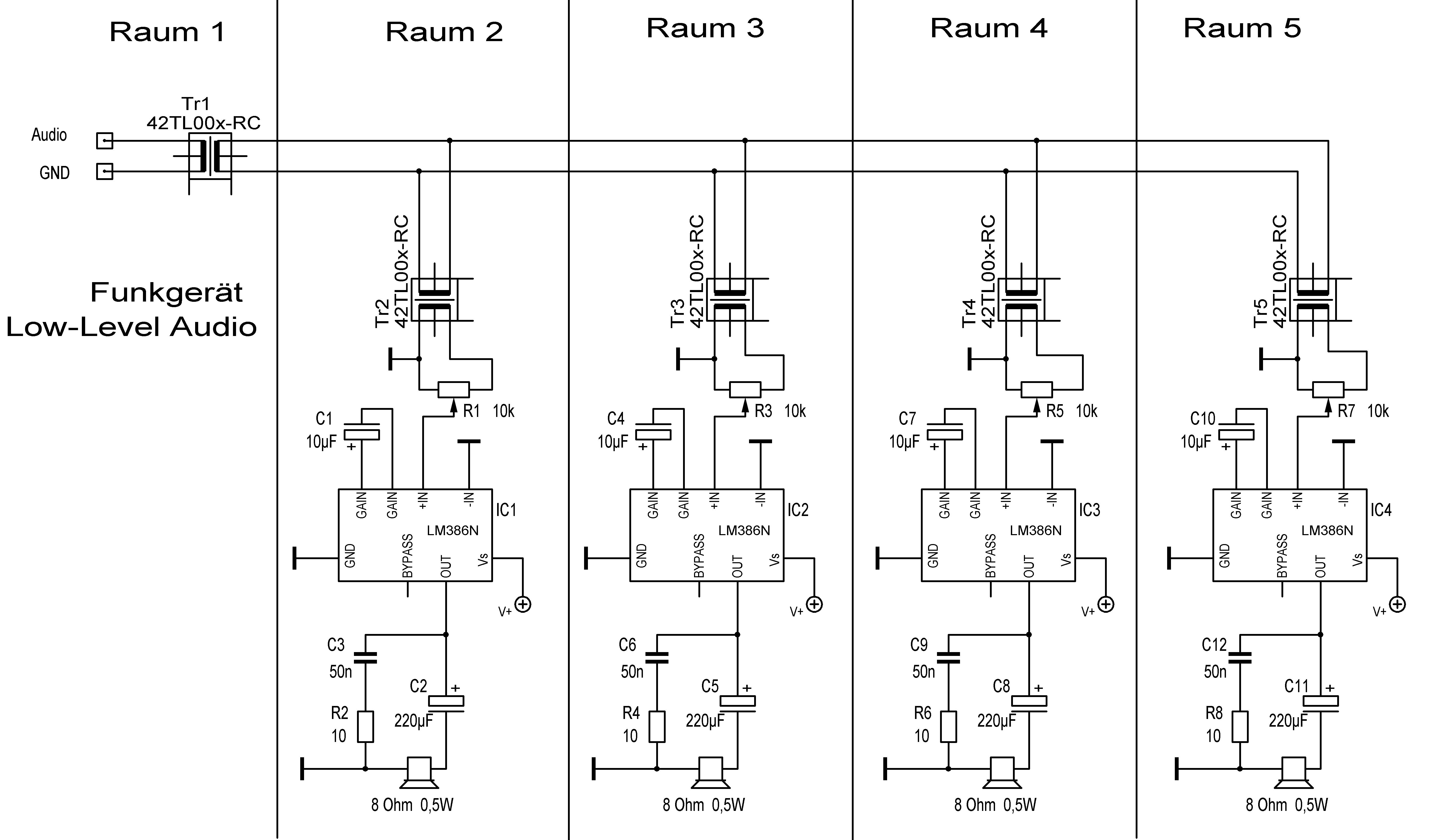 In jedem Raum muss halt nur über ein Steckernetzteil o.ä. eine Versorgungsspannung zwischen 5 und 14V vorhanden sein. Die 5V aus einer USB-Buchse dürfte reichen für die maximal 325mW die aus dem LM386N kommen.