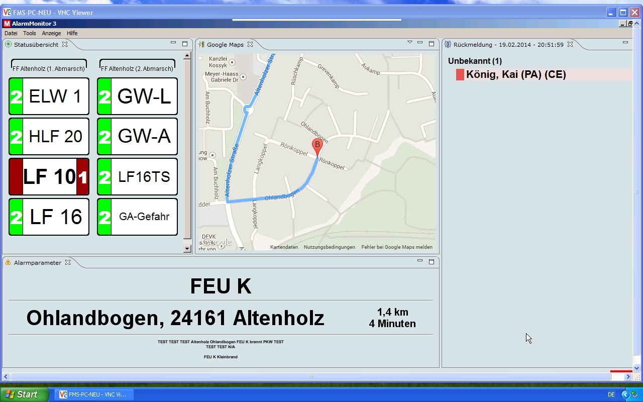 Als Beispiel ein Screenshot von einem Testalarm, bei dem nur ich mit einem Feedback im AM auftauche, obwohl in der App deutlich mehr drin sind.