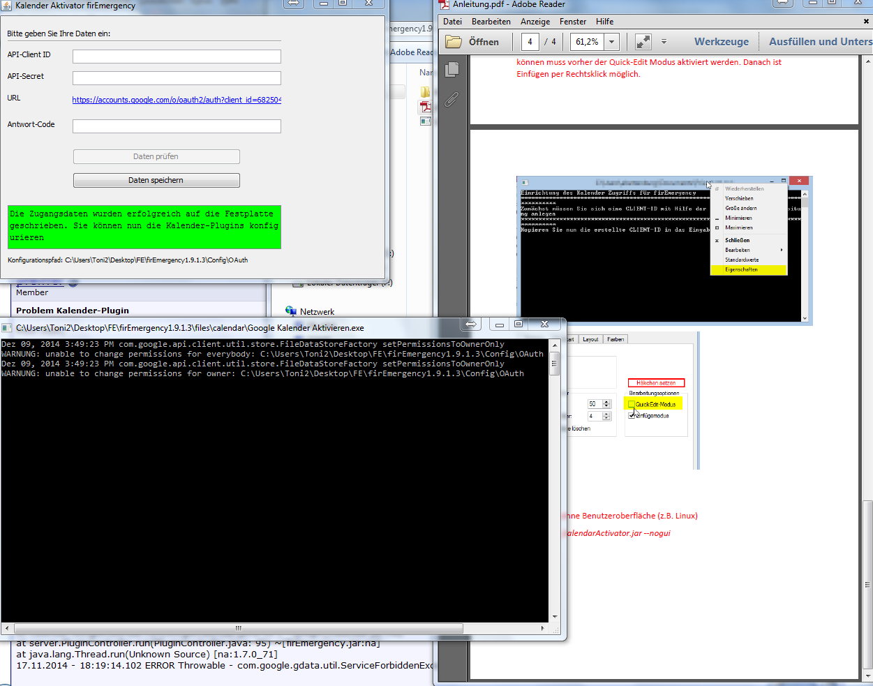 Habe diese Aktivierung probiert: C:\Program Files (x86)\Alamos UG\firEmergency1.9.1.3\files\calendar\Google Kalender Aktivieren.exe und diese C:\Program Files (x86)\Alamos UG\firEmergency1.9.1.3\files\calendar\files\FE_Cal endarActivator.jar beides nichts, es kommt immer die selbe Fehlermeldung beim Neustart von FE-Server.