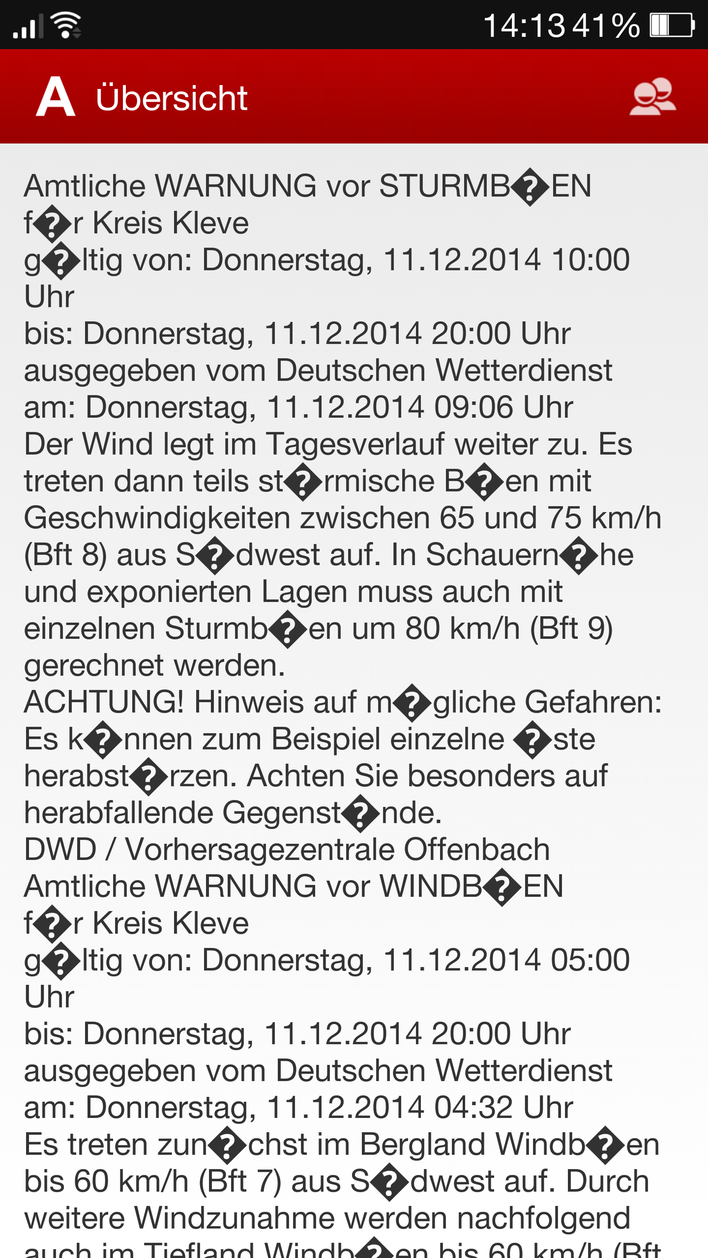 In aPager kam die Meldung zwar an, aber dort waren statt Umlauten Fragezeichen zu sehen (siehe Screenshot).Code:11.12.2014 - 13:56:17.236 INFO AlarmPool - Neuer eingehender Alarm für "wetter" 11.12.2014 - 13:56:17.236 INFO AlarmPool - Kein Sammelalarm 11.12.2014 - 13:56:17.236 INFO WetterInput - Neue Wetterwarnung hinzugefügt 11.12.2014 - 13:56:17.246 INFO AAOController - Suche nach Stichwort in "Amtliche WARNUNG vor STURMBÖEN für Kreis Kleve gültig von: Donnerstag, 11.12.2014 10:00 Uhr bis: Donnerstag, 11.12.2014 20:00 Uhr ausgegeben vom Deutschen Wetterdienst am: Donnerstag, 11.12.2014 09:06 Uhr Der Wind legt im Tagesverlauf weiter zu. Es treten dann teils stürmische Böen mit Geschwindigkeiten zwischen 65 und 75 km/h (Bft 8) aus Südwest auf. In Schauernähe und exponierten Lagen muss auch mit einzelnen Sturmböen um 80 km/h (Bft 9) gerechnet werden. ACHTUNG! Hinweis auf mögliche Gefahren: Es können zum Beispiel einzelne Äste herabstürzen. Achten Sie besonders auf herabfallende Gegenstände. DWD / Vorhersagezentrale Offenbach Amtliche WARNUNG vor WINDBÖEN für Kreis Kleve gültig von: Donnerstag, 11.12.2014 05:00 Uhr bis: Donnerstag, 11.12.2014 20:00 Uhr ausgegeben vom Deutschen Wetterdienst am: Donnerstag, 11.12.2014 04:32 Uhr Es treten zunächst im Bergland Windböen bis 60 km/h (Bft 7) aus Südwest auf. Durch weitere Windzunahme werden nachfolgend auch im Tiefland Windböen bis 60 km/h (Bft 7) aus Südwest erwartet. In exponierten Lagen des Berglandes sind anfangs bereits auch vereinzelt stürmische Böen um 70 km/h (Bft 8) möglich. Der Höhepunkt der Windentwicklung wird voraussichtlich am heutigen Nachmittag erreicht, sodass in den nächsten Stunden gegebenfalls eine höhere Warnstufe herausgegeben werden muss. DWD / Vorhersagezentrale Offenbach " 11.12.2014 - 13:56:17.246 INFO FeedbackController - Lade Feedback-Zuweisungen... 11.12.2014 - 13:56:17.246 INFO FeedbackController - 2 Feedback-Zuweisungen geladen ([LZMaterborn, test]) 11.12.2014 - 13:56:17.246 INFO PipelineController - Pipeline gestartet für wetter 11.12.2014 - 13:56:17.246 INFO Pipeline - Pipeline von Einheit (wetter) wurde mit AlarmData () gestartet 11.12.2014 - 13:56:17.256 INFO PluginController - PluginController mit Plugin weatherrules.Weatherrules (Admin0) mit AlarmData ()wurde gestartet 11.12.2014 - 13:56:17.256 INFO PluginController - PluginController mit Plugin alarmmonitor.AlarmMonitor (Admin3) mit AlarmData ()wurde gestartet 11.12.2014 - 13:56:17.256 INFO AlarmMonitor - Sende Nachricht an AlarmMonitor 3... 11.12.2014 - 13:56:17.256 INFO Weatherrules - Aktuelle Warnstufe des DWD: Warnung vor markantem Wetter 11.12.2014 - 13:56:17.256 INFO Weatherrules - Führe nachfolgende Plugins aus wenn größer gleich 'Wetterwarnung' 11.12.2014 - 13:56:17.256 INFO Weatherrules - Regel erfolgreich. Plugins werden nicht blockiert 11.12.2014 - 13:56:17.256 INFO PluginController - PluginController mit Plugin weatherrules.Weatherrules (Admin0) mit AlarmData () nach 0 ms beendet 11.12.2014 - 13:56:17.256 INFO AlarmMonitor - Verschlüssele Nachricht... 11.12.2014 - 13:56:17.296 ERROR AlarmMonitor - Nachricht an 127.0.0.1 konnte nicht gesendet werden: Illegal key size or default parameters java.security.InvalidKeyException: Illegal key size or default parameters at javax.crypto.Cipher.checkCryptoPerm(Cipher.java:1021) ~[na:1.8.0_25] at javax.crypto.Cipher.implInit(Cipher.java:796) ~[na:1.8.0_25] at javax.crypto.Cipher.chooseProvider(Cipher.java:859) ~[na:1.8.0_25] at javax.crypto.Cipher.init(Cipher.java:1229) ~[na:1.8.0_25] at javax.crypto.Cipher.init(Cipher.java:1166) ~[na:1.8.0_25] at server.misc.AESEncrypter.encrypt(AESEncrypter.java:44) ~[firEmergency.jar:na] at alarmmonitor.AlarmMonitor.run(AlarmMonitor.java:258) ~[plugin_alarmmonitor.jar:na] at server.PluginController.run(PluginController.java:95) [firEmergency.jar:na] at java.lang.Thread.run(Unknown Source) [na:1.8.0_25] 11.12.2014 - 13:56:17.296 INFO PluginController - PluginController mit Plugin alarmmonitor.AlarmMonitor (Admin3) mit AlarmData () nach 40 ms beendet 11.12.2014 - 13:56:17.356 INFO PluginController - PluginController mit Plugin apagerIOS.ApagerIOS (Admin1) mit AlarmData ()wurde gestartet 11.12.2014 - 13:56:17.356 INFO PluginController - PluginController mit Plugin apager.Apager (Admin2) mit AlarmData ()wurde gestartet 11.12.2014 - 13:56:17.356 INFO Apager - Versende Nachricht an aPager 11.12.2014 - 13:56:17.356 INFO SendMessage - Größe der Nachricht: 2463 11.12.2014 - 13:56:17.366 INFO SendMessage - Bereite Nachricht für Verschlüsselung vor... 11.12.2014 - 13:56:17.366 ERROR SendMessage - Nachricht konnnte nicht verschlüsselt werden java.security.InvalidKeyException: Illegal key size or default parameters at javax.crypto.Cipher.checkCryptoPerm(Cipher.java:1021) ~[na:1.8.0_25] at javax.crypto.Cipher.implInit(Cipher.java:796) ~[na:1.8.0_25] at javax.crypto.Cipher.chooseProvider(Cipher.java:859) ~[na:1.8.0_25] at javax.crypto.Cipher.init(Cipher.java:1229) ~[na:1.8.0_25] at javax.crypto.Cipher.init(Cipher.java:1166) ~[na:1.8.0_25] at server.misc.AESEncrypter.encrypt(AESEncrypter.java:44) ~[firEmergency.jar:na] at apager.SendMessage.toRecepient(SendMessage.java:104) ~[plugin_apager.jar:na] at apager.Apager.run(Apager.java:119) [plugin_apager.jar:na] at server.PluginController.run(PluginController.java:95) [firEmergency.jar:na] at java.lang.Thread.run(Unknown Source) [na:1.8.0_25] 11.12.2014 - 13:56:17.366 INFO SendMessageApagerIOS - Größe der Nachricht: 2527 11.12.2014 - 13:56:17.956 INFO SendMessage - Nachricht erfolgreich versandt 11.12.2014 - 13:56:17.956 INFO PluginController - PluginController mit Plugin apager.Apager (Admin2) mit AlarmData () nach 600 ms beendet 11.12.2014 - 13:56:17.996 INFO SendMessageApagerIOS - Versende Push-Nachrichten... 11.12.2014 - 13:56:24.716 INFO SendMessageApagerIOS - Nachrichten erfolgreich versandt 11.12.2014 - 13:56:24.716 INFO PluginController - PluginController mit Plugin apagerIOS.ApagerIOS (Admin1) m