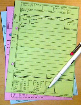 Will man davon ausgehen dass Helfer immer Strom haben und folglich doch mit EDV-Unterstuetzung weiterarbeiten und zusaetzlich bedrucktes Papier produzieren, dann waere es m.E. die sinnvollste Loesung die, die (ehemals) farbigen Durchschlaege am oberen (und ggf unteren) Rand mit unuebersehbar fetter Schrift farbig zu kennzeichnen, also als Schriftzug die entspr. Sollfarbe einzustragen. Somit kann also jedes dieser Formblaetter ganz simpel mit jeder Word-Version nachgebildet werden und durch ein geeignetes Makro die Farbbezeichnung "eingestempelt" werden. Das geht auch mit Excel und Access. Letzteres haette den Vorteil dass die EDV dann gleich sinnvoll genutzt werden koennte, wenn nicht eh ein kommerziell erstelltes Programm zum Einsatz kommt.