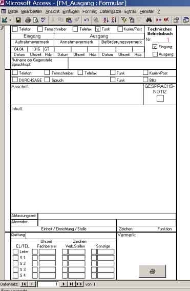Wozu brauchst du denn ein solches Program? Da der Weg der Nachrichtenvordrucke in einer Fm-Zentrale vorgeschrieben ist, müßten die 4 Vordrucke erst einmal zum Sichter und dieser verteilt dann die Zettel. Außerdem was mchts du mit den Mitteilungen, die evtl. "nur" für das ETB oder die Lagekarte intressant sind. Desweiteren gibt es leider auch unterschiedliche Vordrucke in den Fm-Zentralen, so das es bei "einem" Programm wahrscheinlich nicht bleibt.