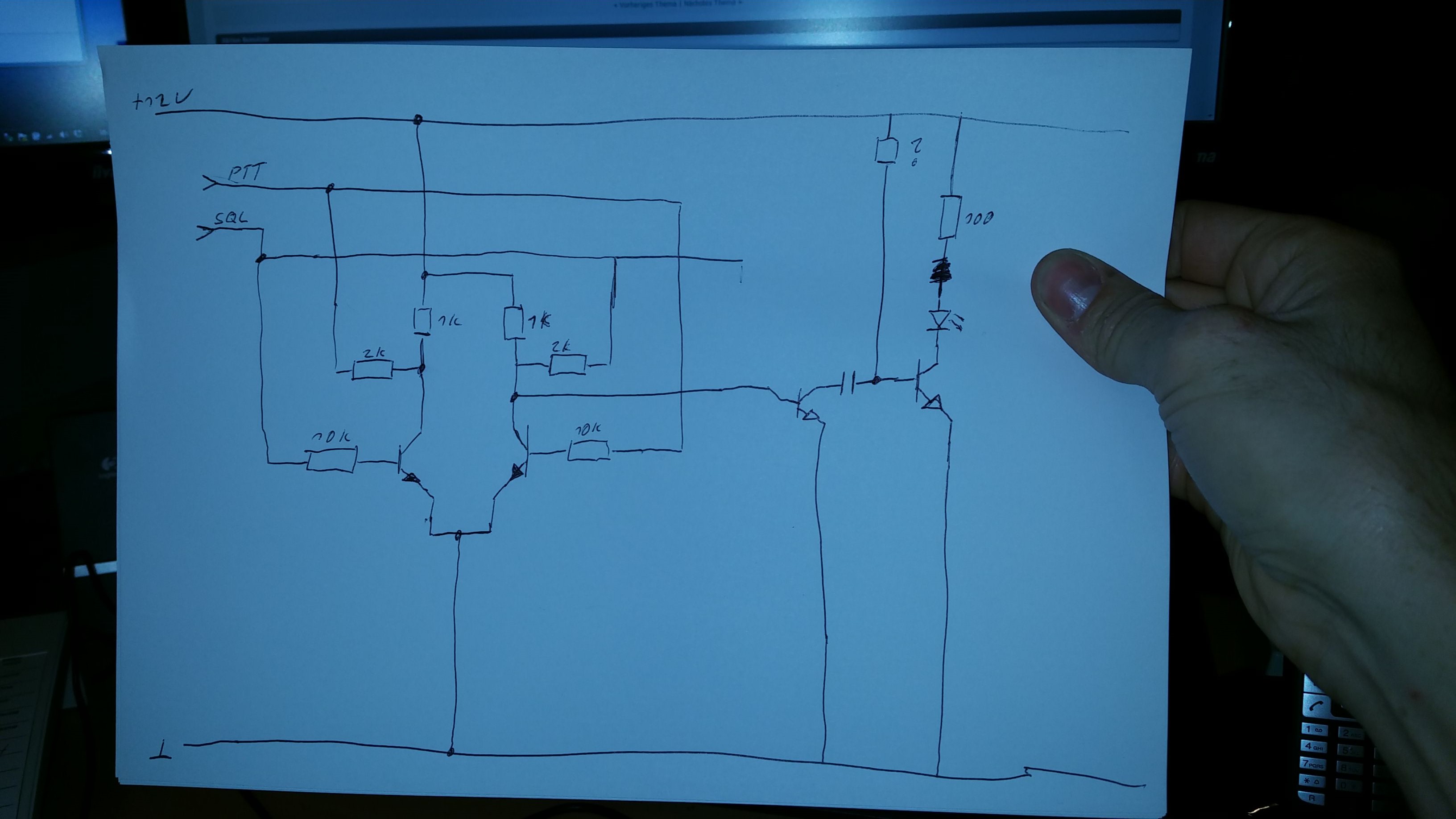 ich möchte eine Rufsignalisierung für ein FuG8 bauen, dazu soll im Hörer eine LED eingebaut werden. Wenn ein Signal ankommt (also SQL Spannung führt) soll sie leuchten, wenn dann SQL wieder abfällt soll sie blinken bis jemand auf den Ruf antwortet (also PTT spannung bekommt) dann soll sie wieder ausgehen bis das Spiel von vorne anfängt. Ich habe mal ein paar Gedanken auf ein Papier gebracht, vielleicht kann mal jemand drüber schauen und mir sagen ob das passen könnte bzw wie ich weiter komm.