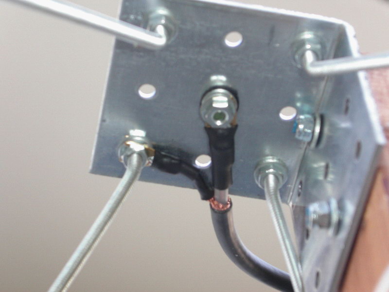 Als Grundträger benutze ich einen L-Winkel aus dem Baumarkt, den man zum Verbinden von Holzbalken braucht. So etwa 5 cm breit. Ist nicht kritisch. In die Mitte des einen Schenkels wird ein Loch gebohrt, so dass man von unten eine BNC Buchse einbauen kann. Manchmal ist dort schon ein passendes Loch vorgebohrt. Das Kabel wird dann von unten an diese BNC Buchse angeschlossen. Dann braucht man 5 Messingstäbe von 90 cm Länge ( für 4m ). An 4 Stück biegt man am Ende eine kleine Ösen und schraubt sie mit einer Schraube an die 4 Ecken des Winkels. Dann biegt man sie schräg so 45° nach unten. Der 5. Stab kommt an den Innenkontakt der BNC Buchse. Man muss ihn dann gegen Umfallen sichern. Zum Beispiel durch einen Dübel ( hat CHABBY so gemacht ) oder durch eine Plastikhülse, die man mit Heißkleber oder 2-Komponentenkleber auffüllt. Von Hand festhalten geht auch, sofern die Versuchsperson nachts nicht einschläft und umfällt.