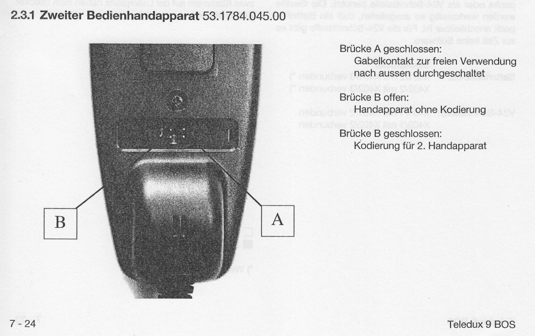 beim zweiten Handapparat BHA902 ist eine Abdeckung zwischen Sprechtaste und Mikrofon. Unter dieser sind zwei Brücken zu sehen, die linke Brücke als Kodierung für den 2. Handapparat muß geschlossen sein.