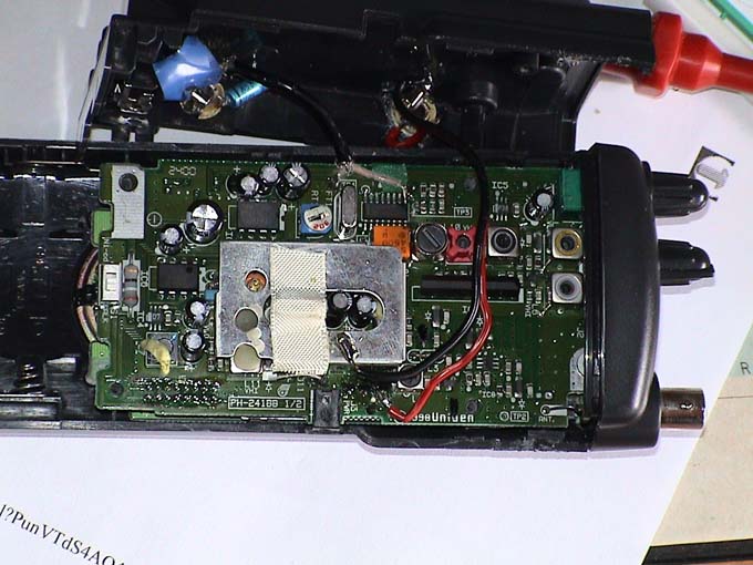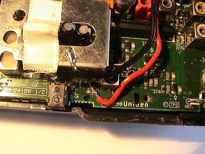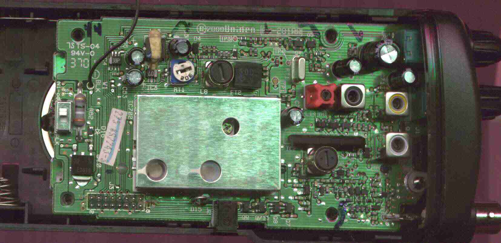 Dann haste rechts daneben drei Transistoren und an die Basis des ganz rechten lötest du das NF-Signal dran, an das große Abschirmblech die Masse....