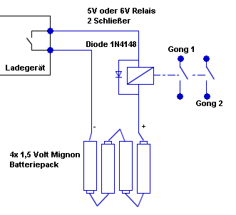 warum über AA Baterien? Wenn ich mir schonn ein Relai kaufen soll kann ich auch die 9V DC die an zwei Testpunkten im Ladegerät anliegen an den Relai-kontakt legen und kann somit die Batterien sparen und bin nicht Kapazitätsabhängig (Batterie Leer).