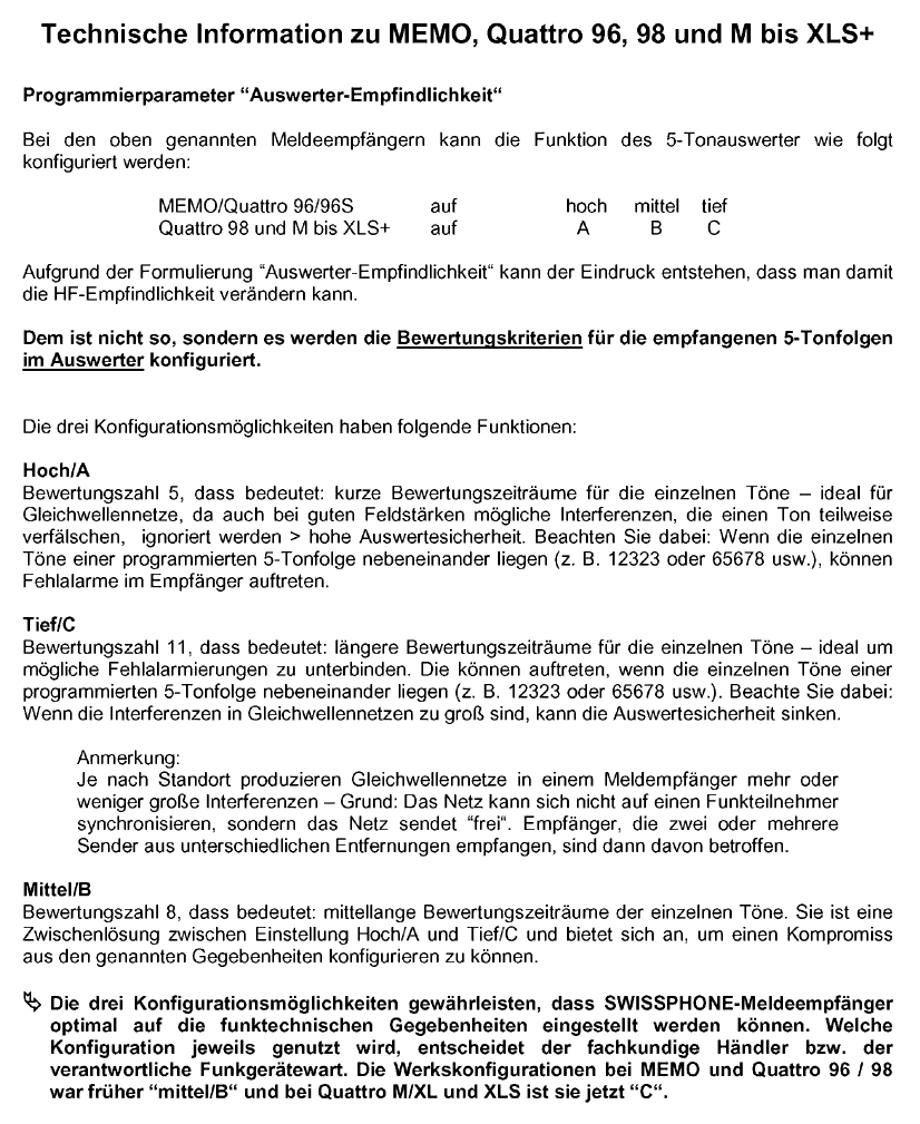 Da die Fragen zum Thema "Fehlauswertung" und "Auswerteempfindlichkeit" immer wieder auftauchen, poste ich hier mal ein Schreiben von Swissphone welches ich im Netz gefunden habe.