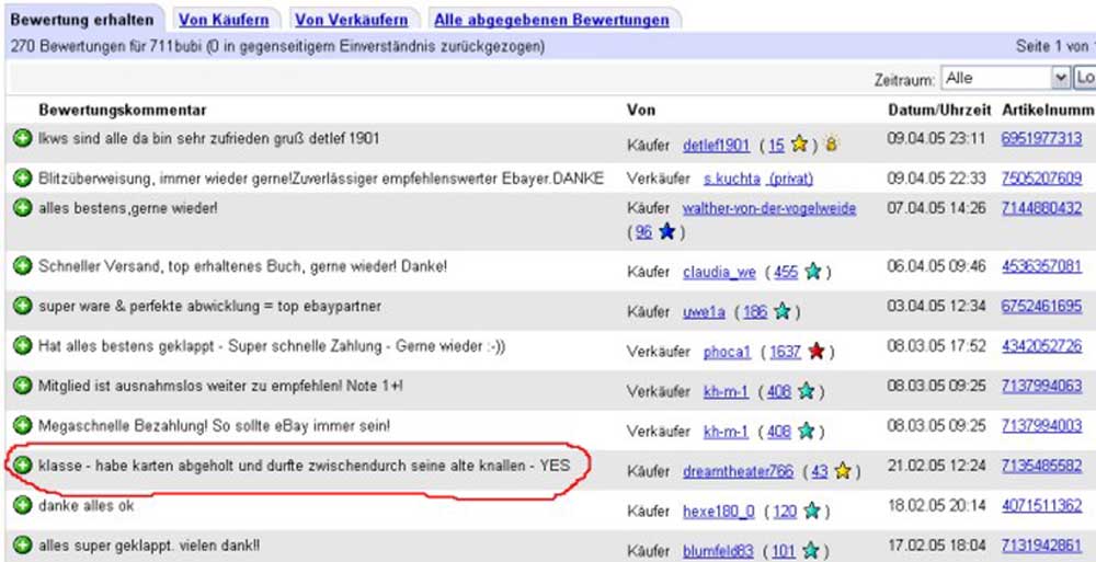 Ich hab gestern die Highlights vieler Ebay-Bewertungen per Email bekommen. Absolut lustig was sich manche da einfallen lassen. :)